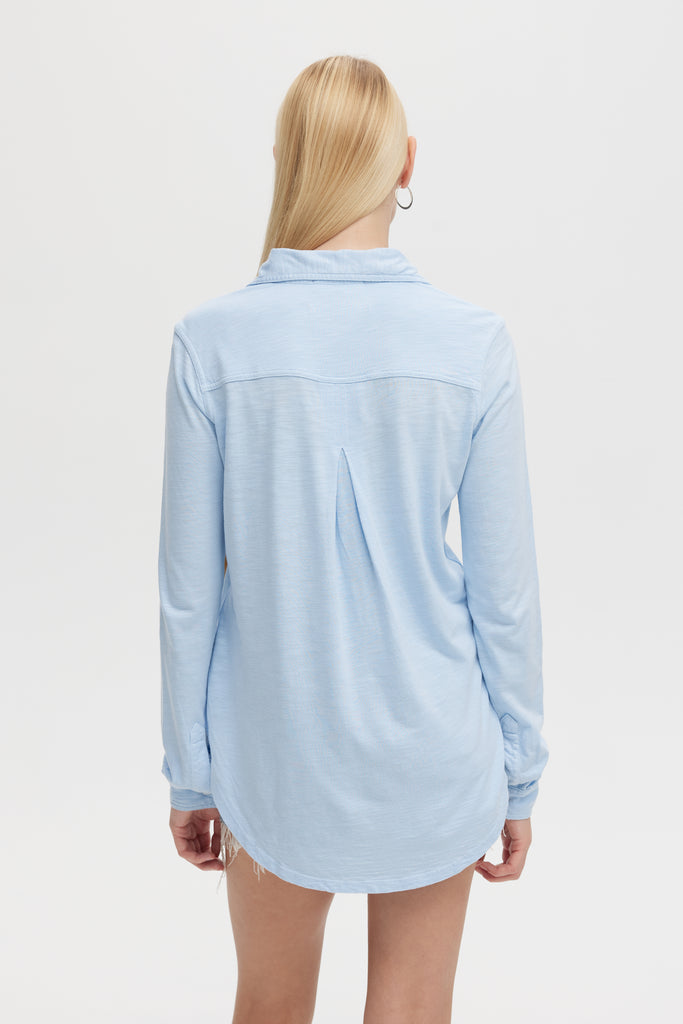 The AMRAT Jersey Blouse blends the polish of a button-down with the comfort of a tee. Crafted from soft slub jersey, this long-sleeve shirt is breathable, lightweight, and finished with a curved hem for an easy drape. The front pocket and relaxed fit keep it laid-back yet elevated—perfect for throwing on over denim, cutoffs, or even layered under a blazer.