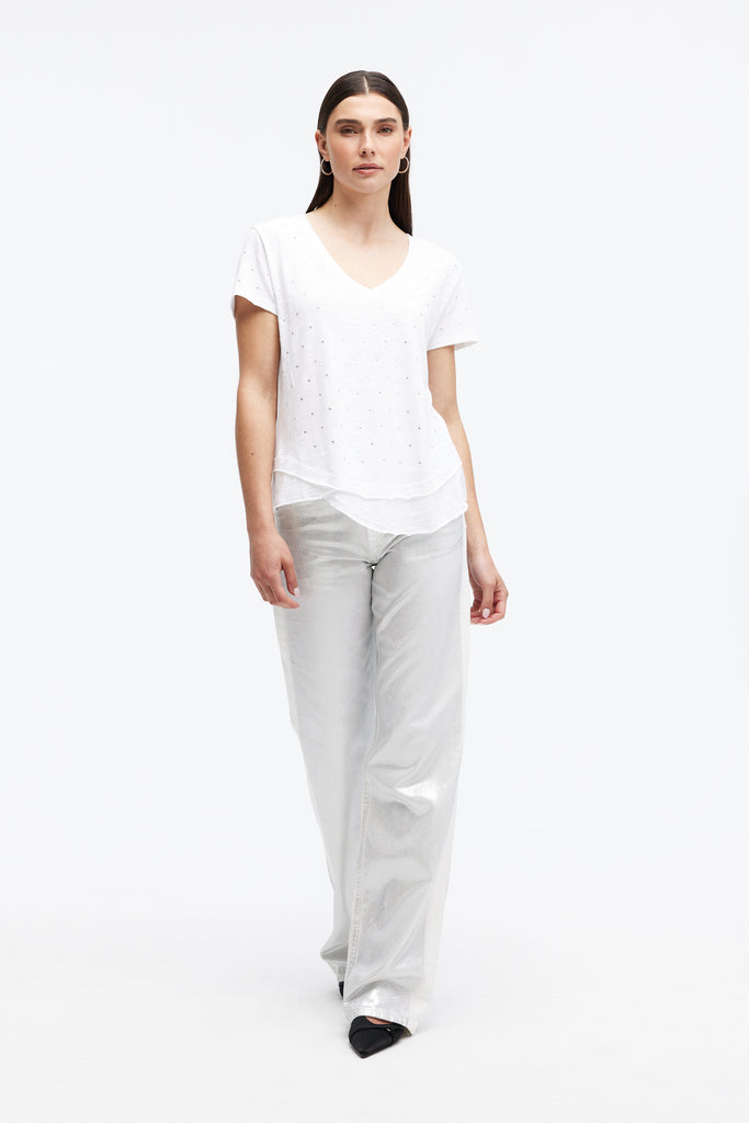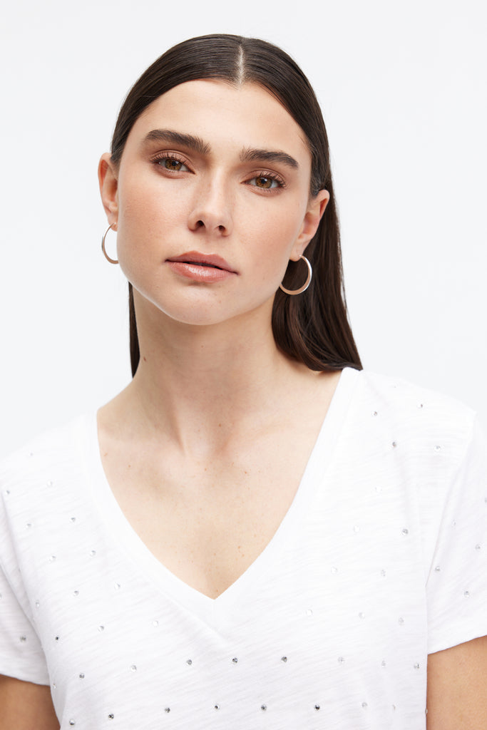 The Ava All Over Studs T-Shirt effortlessly combines comfort and elegance. Featuring a flattering V-neckline and delicate stud details, this mock-layered design brings a touch of shimmer to your everyday style. Crafted from soft, breathable fabric, it’s perfect for pairing with denim or elevating with a blazer—making it your go-to for any occasion.