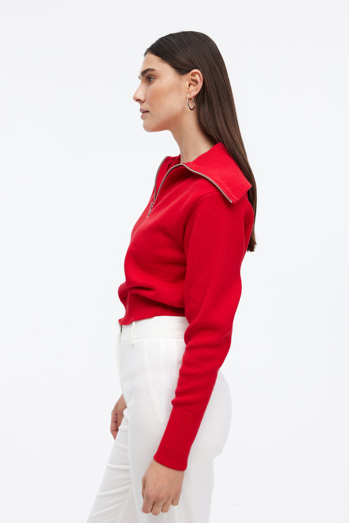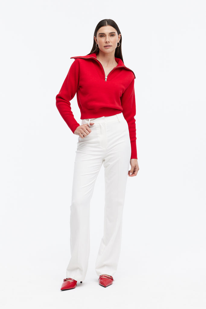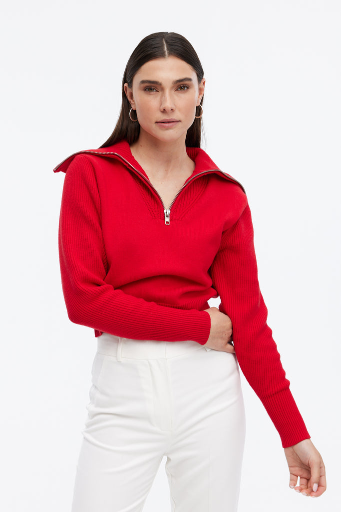 The HAZEL sweater redefines cool-weather style with its structured silhouette and bold zip-up collar. Made from a soft knit, this vibrant red piece adds just the right amount of edge to any look. Whether zipped up for a cozy feel or worn open for a laid-back vibe, the HAZEL pairs effortlessly with tailored trousers or denim. Ribbed cuffs and hem keep the fit snug and flattering, making it a versatile piece for workdays or weekends. This is your go-to sweater for elevated everyday wear.