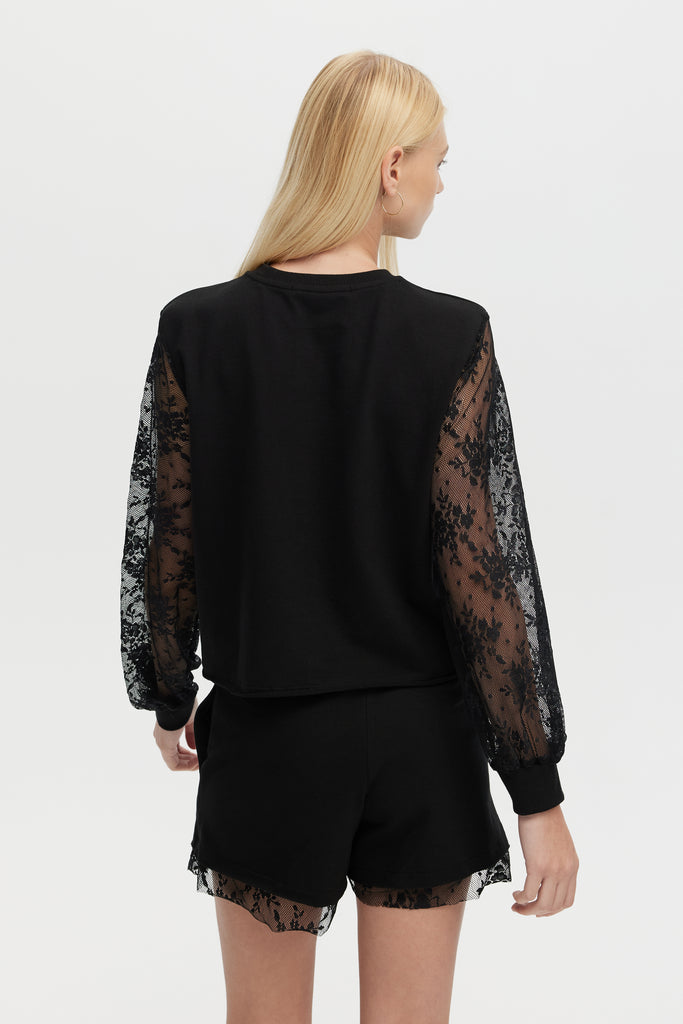 The KAYLA & ELIZA Lace Set is a bold blend of romance and loungewear. Featuring a crewneck sweatshirt with sheer lace sleeves and matching shorts with lace trim peeking through the hem, this set takes everyday comfort to an elevated place. Wear it together for a striking statement or mix and match for endless versatility.