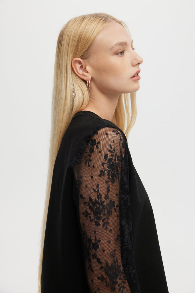 ✔️ Lace sleeves – floral-patterned sheer lace adds an ethereal edge.