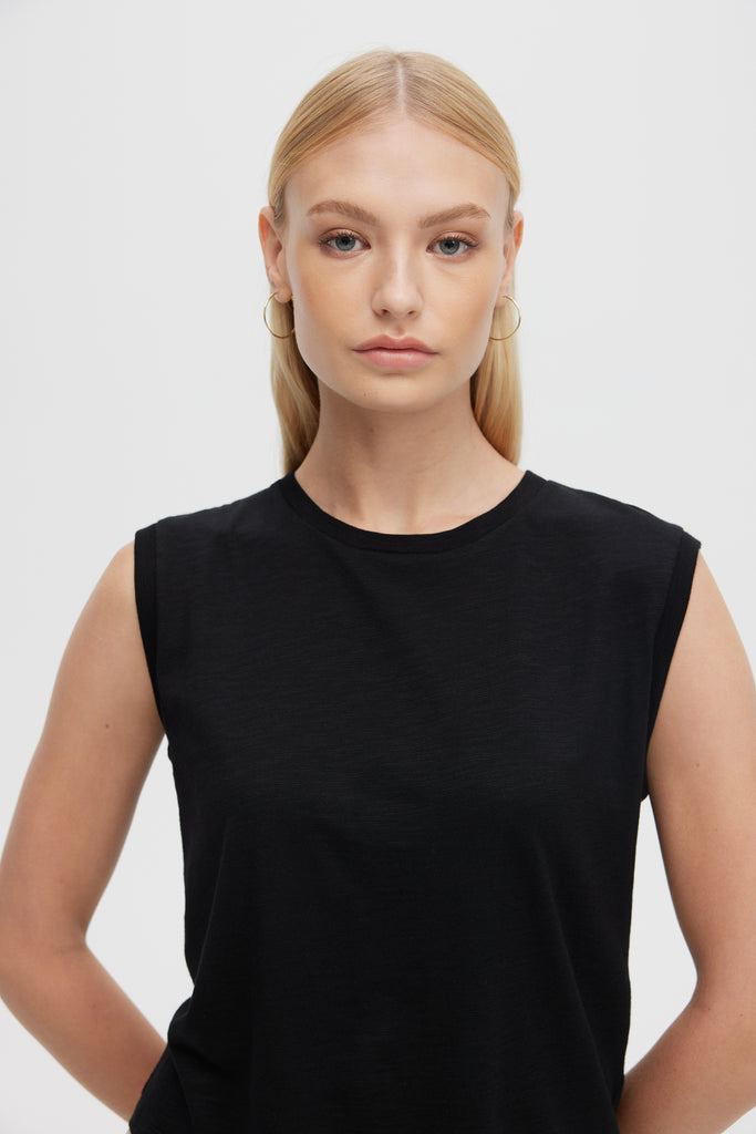 ✔️ Sleeveless cut with slight shoulder drop – relaxed, modern, and effortlessly flattering.