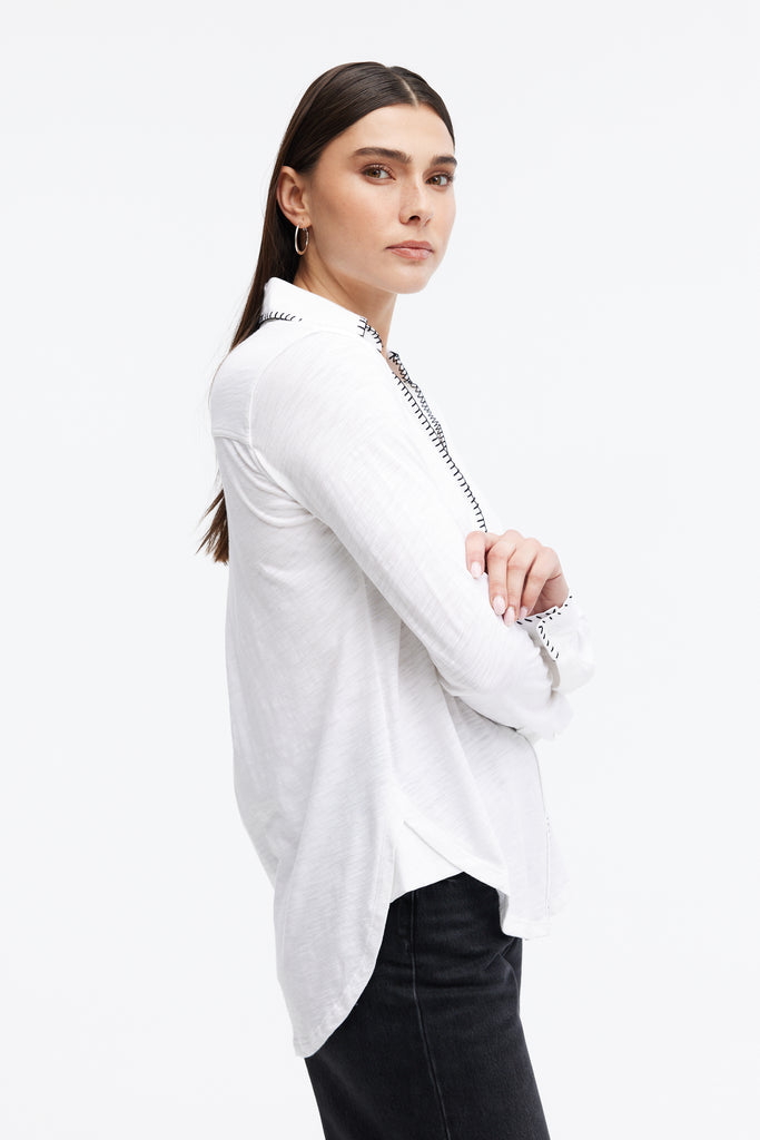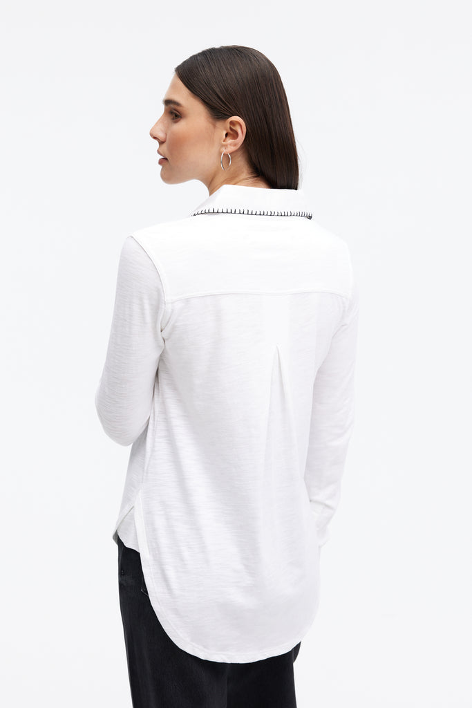 Designed for comfort and versatility, the relaxed fit and curved hem make it easy to style, whether tucked into tailored trousers for the office or left loose over jeans for a chic casual look. With its delicate stitching and polished design, the Whipstitch Amrat is your go-to piece for effortless elegance.
